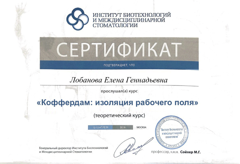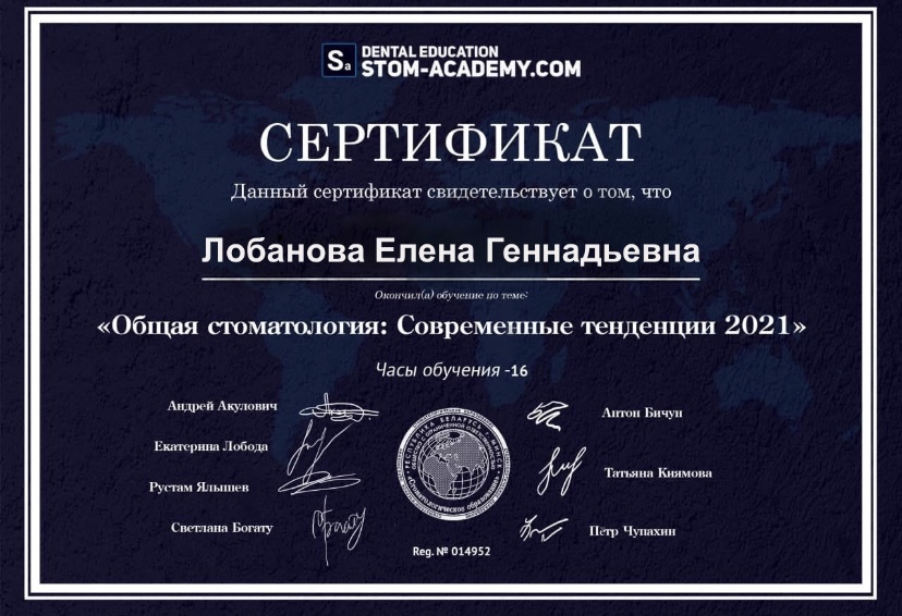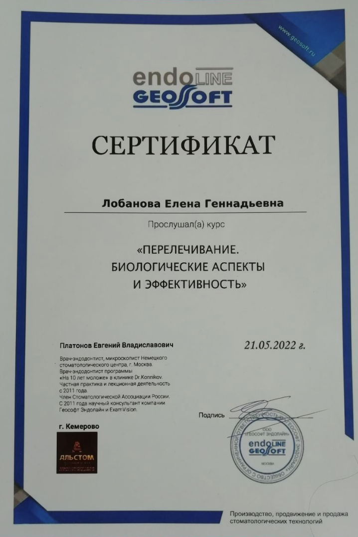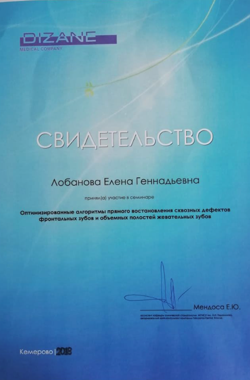 2017 г. — «Кемеровский государственный медицинский университет», стоматология терапевтическая ( повышение квалификации)