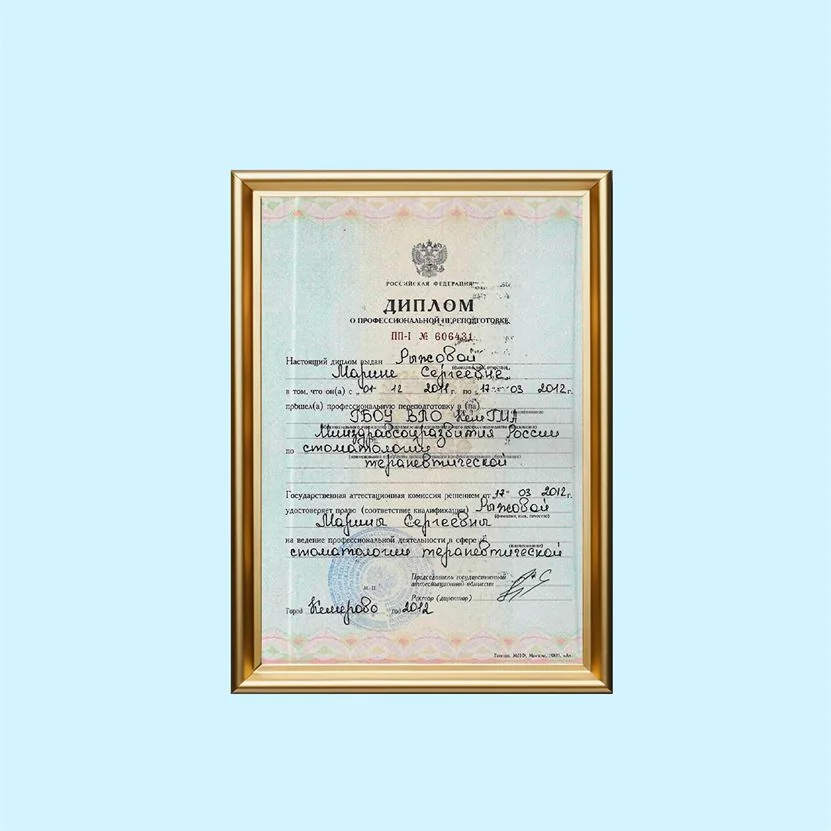2012 г. — «Кемеровский государственный медицинский университет», Стоматология терапевтическая (повышение квалификации)